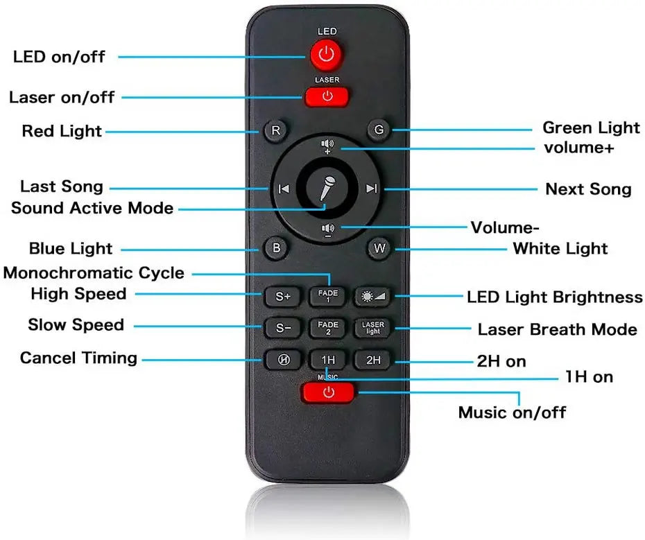 Functions: LED Projector light, Music Speaker, Bluetooth, Remote control